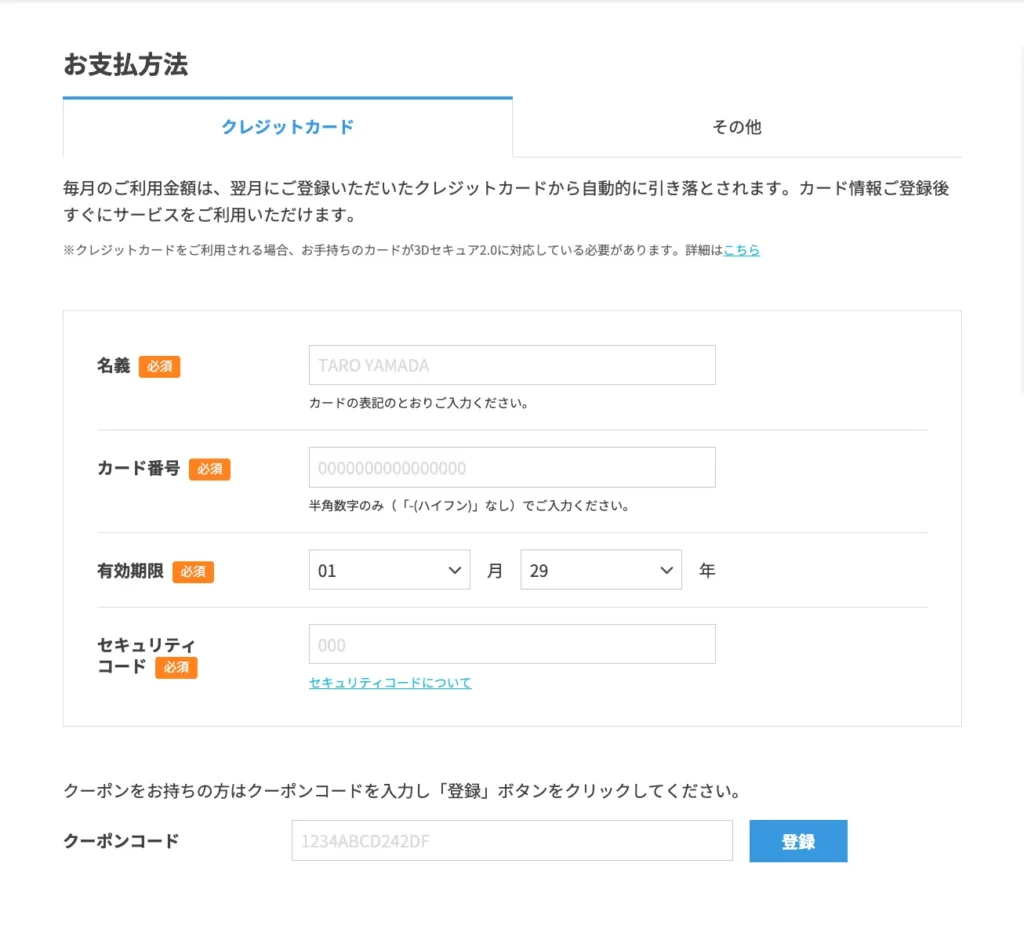 - お支払い方法: クライアント様名義のカード情報を入力し、「お申し込み」をクリック!