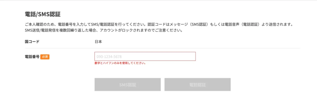 - SMS/電話認証: 電話番号を入力し、届いた認証コードを入力します。